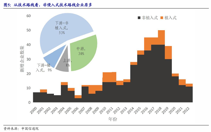 从技术路线看,非侵入式技术路线企业居多。根据中国信通院,截至2023年第一季度,全球脑机接口代表性企业超500家。其中,上游占8%,包括生产制造和销售电极、芯片、外设、相关核心器件的企业;中游占30%,包括生产制造和销售医用及科研用工具、分析软件和采集设备的企业;下游占62%,其中提供应用解决方案的侵入式技术路线企业占比9%,非侵入式技术路线企业占比53%。从技术路线看,非侵入式技术路线企业居多。全球500余家脑机接口相关企业中,20%从事侵入式技术研发,80%从事非侵入式技术研发。
