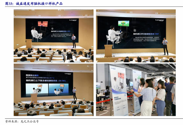 其中两款是基于视觉诱发电位范式的产品——脑机接口认知康复系统、脑机接口手功能康复系统,另一款是基于视觉强化运动想象的创新混合范式产品——脑机接口上下肢主被动康复系统,产品将非侵入式脑机接口技术与龙之杰现有的康复产品进行了融合升级,并在应用场景中展现了核心技术亮点,同时公司也在积极推进上述产品医疗器械证的申请注册和临床试用。
