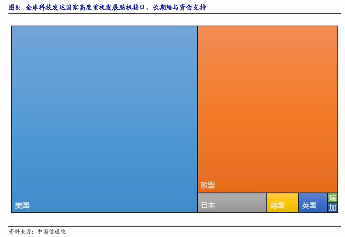 全球科技发达国家高度重视发展脑机接口,长期给与立项和资金支持。2013年,美国启动“推进创新神经技术脑研究计划”,2021年该项目公布了在分子水平上绘制的哺乳动物初级运动皮层细胞类型特征图,是迄今为止绘制哺乳动物大脑最全面细致的图谱。美国在2013年脑计划之后持续进行脑机接口的科研投入,国立卫生研究院(NIH)、国家科学基金会(NSF)、国防高级研究计划局(DARPA)等政府部门资助了多家高校和公司开启脑机接口相关研究,科研项目数量和资助资金总额全球领先。