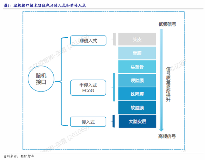脑机接口技术路线包括侵入式和非侵入式。根据《人民日报》刊发的明东教授署名文章《脑机接口:从科幻走向现实》,侵入式脑机接口需通过手术等方式直接将电极侵入到大脑皮层获取神经信号。此类脑机接口所获取的信号空间分辨率好、信噪比高,但需通过外科手术侵入体内,安全性低、成本高,容易引发免疫反应和愈合反应,进而导致所采信号衰退甚至消失。