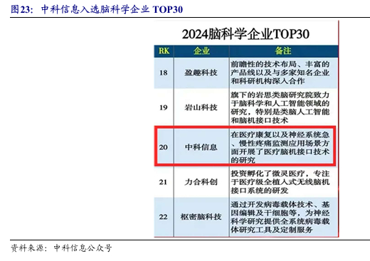 中科信息入选脑科学企业TOP30。中科信息作为中国科学院控股有限公司打造的人工智能板块重点企业,数十年来专注于人工智能技术、产品的研发与应用落地。智慧医疗领域,公司在2007年初就与四川大学华西医院建立了良好的产学研合作关系,布局智慧医疗领域的开拓。在双方深入合作基础上,公司自主研发了从诊疗教学到临床应用的系列智能化产品。辅助麻醉医生进行术中诊断决策的智能麻醉机器人(一代)主要用于解决麻醉医生紧缺、工作负荷大的痛点,提高手术精准度,降低事故风险率,造福于民。根据公司公众号,目前,该产品即将进入临床试验,正在进行第三类医疗器械认证。