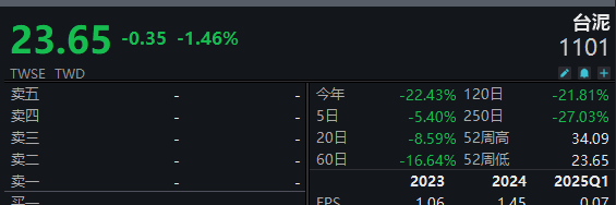 受此影响,在中国台湾股市开盘后,台泥集团股价大幅跳水,盘中一度大跌超3%,一度跌破23元/股(新台币,下同),盘中最低股价创出2009年第二季度以来的新低,截至发稿,跌幅有所回落。