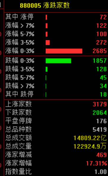 两市共3179只个股上涨,72只个股涨停,2064只个股下跌,18只个股跌停。