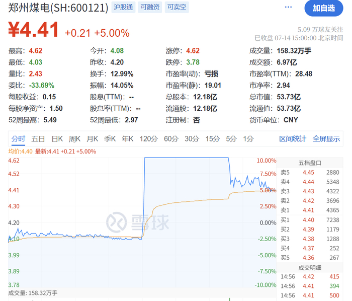 7月14日,煤炭板块午后拉升,郑州煤电一度直线涨停,山煤国际、辽宁能源、华电能源、恒源煤电、盘江股份等纷纷走高。