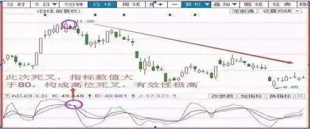如上图所示,股价冲高震荡后,KDJ指标在数值80上方发出死叉,构成KDJ高位死叉,此时死叉的有效性极高,投资者应果断逢高离场。