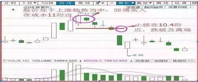 如上图,股价处于放量上涨的趋势当中,追高买入在11块附近,此时要带好止损比如10.4,如果后期跌破止损位,就说明自己趋势判断失误,果断止损纠正错误以免更大的损失。