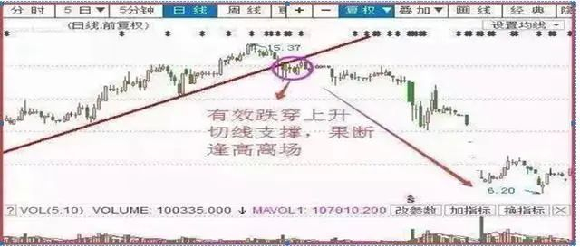 如上图所示,股价前期一直处于上涨趋势线上方运行,在高位回踩支撑线时有效跌穿趋势线,此时上涨趋势的形态被破坏,投资者应该果断出局,以免面临更大的损失。