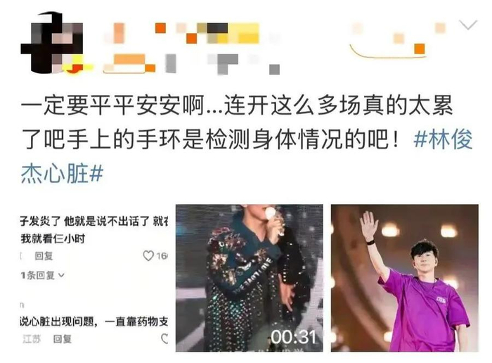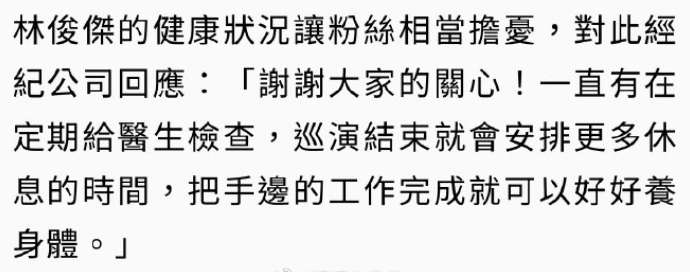 7月14日,针对心脏出问题的消息,林俊杰经纪公司回应:“谢谢大家的关心!一直有在定期找医生检查,巡演结束就会安排更多休息的时间,把手边的工作完成就可以好好养身体。”