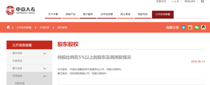 作为首家中外合资寿险公司,从股权结构来看,中意人寿保险有限公司于2002年由中国石油天然气集团有限公司和意大利忠利保险有限公司共同发起成立,各持股50%。2016年9月,中石油集团将其持有的50%股权无偿划转给中石油集团资本有限责任公司,中意人寿的股东架构自此变为中石油集团资本有限责任公司与意大利忠利保险有限公司各持股50%。