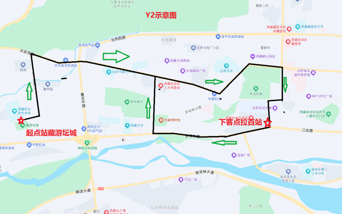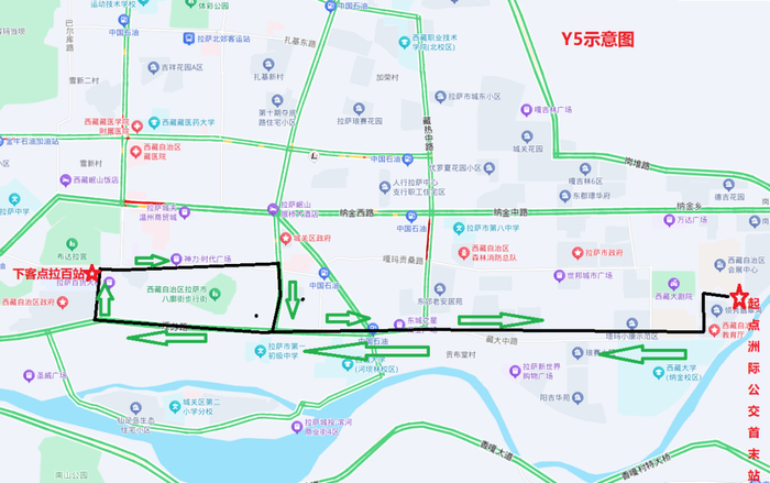Y5线路全长15公里,运行时间:20:00至00:00,经过路段:塔玛东路—藏大东路—江苏西路—康昂多南路—北京东路—林廓东路中段—江苏东路—藏大东路—塔玛东路。