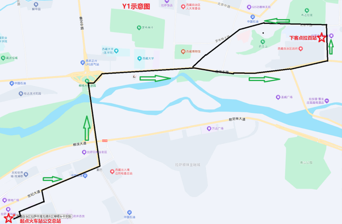 Y1线路全长15.2公里,运行时间:20:00至00:00,经过路段:通站路—北京大道—世纪大道—柳梧大桥—金珠东路—康昂多南路—北京中路—林廓西路—罗布林卡路—金珠西路—柳梧大桥—世纪大道—北京大道—通站路。