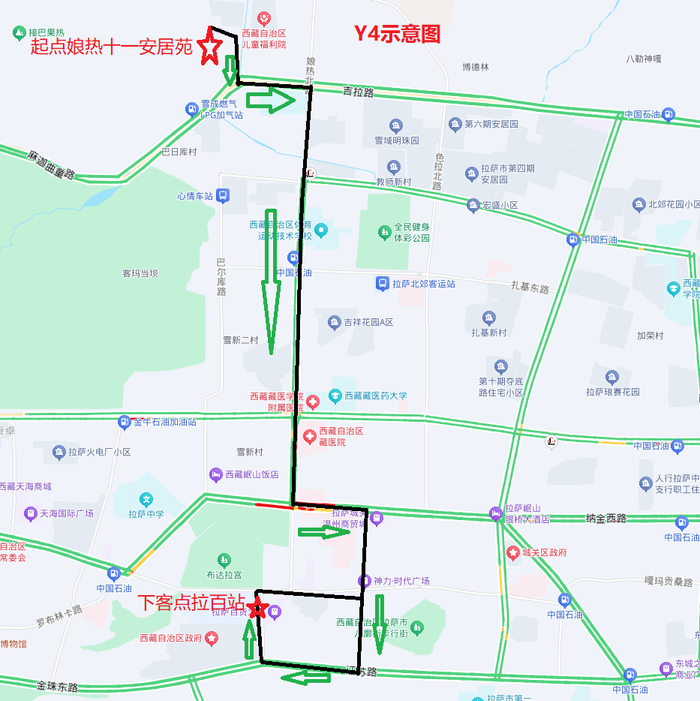 Y4线路全长17公里,运行时间:20:00至00:00,经过路段:娘热十一安居苑—吉拉路—娘热南路—康昂多南路—金珠西路—德吉北路—北京中路—娘热北路—吉拉路—娘热十一安居苑。
