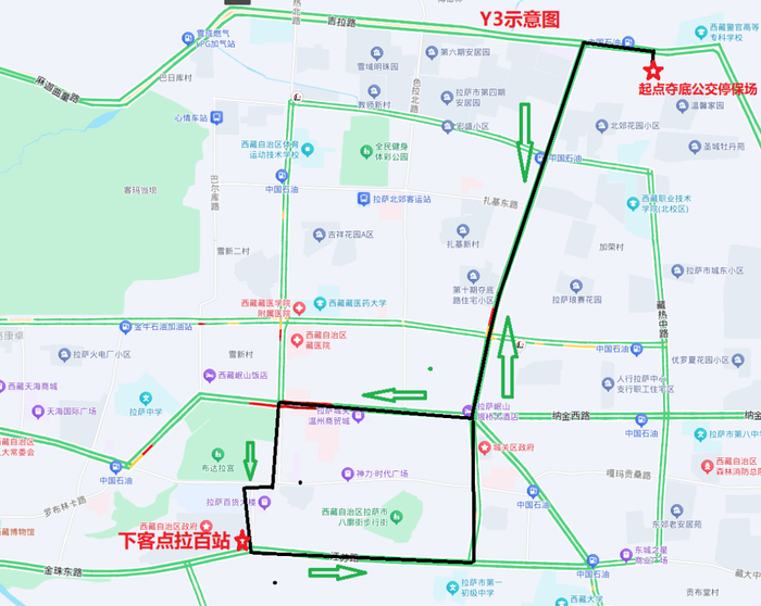 Y3线路全长13.8公里,运行时间:20:00至00:00,经过路段:吉拉路—夺底路北段—夺底南路—林廓西路—娘热南路—北京中路—康昂多南路—江苏路—林廓东路中段—夺底北路段—吉拉路。