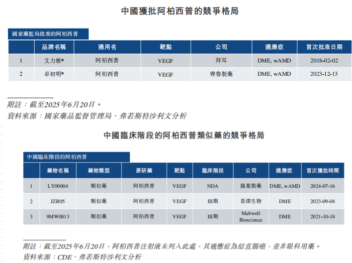 截至2025年6月20日,中国市场已获批2款阿柏西普类药物。拜耳公司的原研药艾力雅于2018年2月获批;齐鲁制药的生物类似药卓初明于2023年12月获批上市。