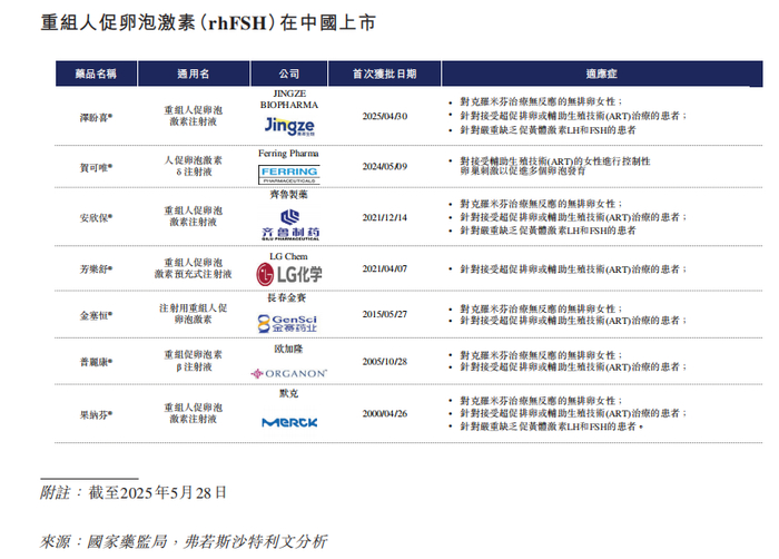截至2025年5月28日,中国市场上共有7种重组人促卵泡激素产品在售,包括长春高新子公司金赛药业旗下的金赛恒(2015年获批)、默克公司的果纳芬(2000年获批)、齐鲁制药的安欣保(2021年获批)等。不难发现,上述三家药企获批时间早于景泽生物的JZB30四年以上。