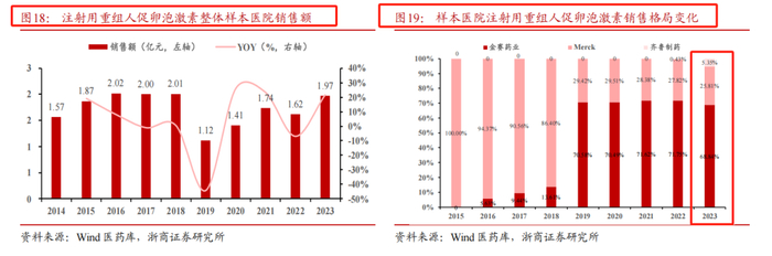 值得一提的是,行业龙头金赛药业已推出金赛恒(粉针剂)和金赛恒(水针剂),浙商证券分析师预测金赛药业的重组人促卵泡激素产品在2023年-2026年收入复合增速有望达到24%。