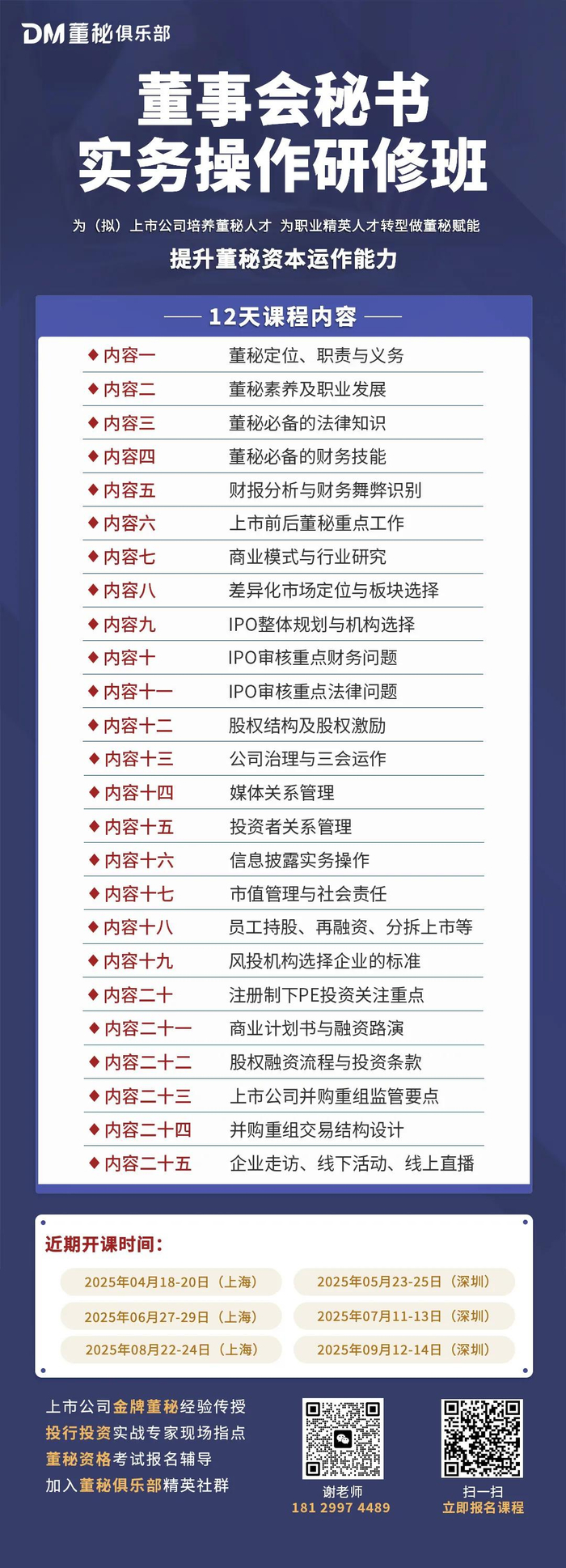 董秘俱乐部《董秘实务操作研修班》从实务角度进行全面系统解析,帮助您全面掌握董秘技能。欢迎咨询【谢老师 181 2997 4489 微信同号】。