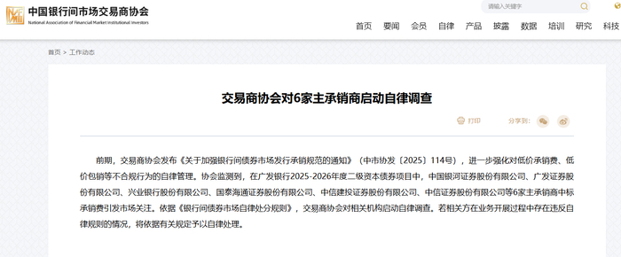 中国经济网北京7月14日讯 中国银行间市场交易商协会(下称“交易商协会”)网站7月11日发布了交易商协会对6家主承销商启动自律调查的公告。前期,交易商协会发布《关于加强银行间债券市场发行承销规范的通知》(中市协发〔2025〕114号),进一步强化对低价承销费、低价包销等不合规行为的自律管理。