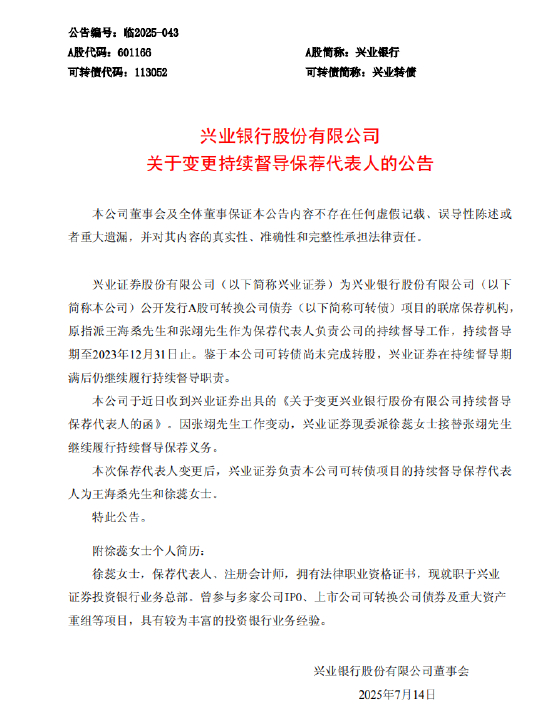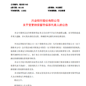 7月14日金融一线消息,兴业银行发布公告称,兴业证券股份有限公司(以下简称兴业证券)为兴业银行股份有限公司(以下简称本公司)公开发行A股可转换公司债券(以下简称可转债)项目的联席保荐机构,原指派王海桑和张翊作为保荐代表人负责公司的持续督导工作,持续督导期至2023年12月31日止。鉴于本公司可转债尚未完成转股,兴业证券在持续督导期满后仍继续履行持续督导职责。