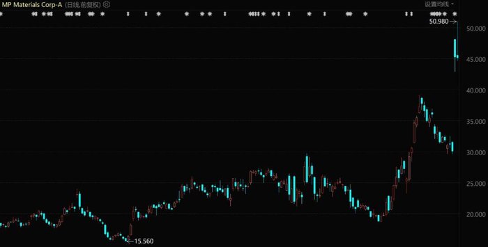 受此消息影响,近期美股稀土板块行情异动。7月11日,MP Materials股价一度暴涨逾40%,USA Rare Earth盘前涨17%,Energy Fuels一度涨逾10%。