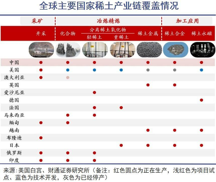 中国能打稀土牌,并非不怕污染、不要利润,而是真的有技术优势和产业链竞争力。稀土产业链各环节技术含量均较高,全球范围内仅有少数国家具备关键环节生产能力,而中国是当前唯一具备稀土全产业链生产能力的国家。