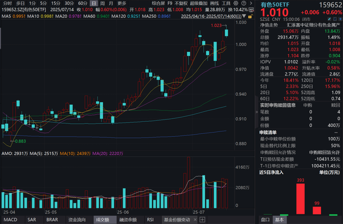 7月14日,稀土、贵金属板块开盘大涨,带动有色板块冲高,有色50ETF(159652)冲高回落,全天红盘震荡,收涨0.6%,喜提三连涨!