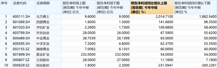 此外,不少上市公司发布业绩预告,受金价持续位于高位、稀土均价上涨影响,涉及金矿、稀土类的上市公司业绩普遍表现不俗。其中,北方稀土预计2025年上半年实现归母净利润9.0-9.6亿元,同比增长1882.54%- 2014.71%;西部黄金预计2025年上半年实现归属于上市公司股东的净利润同比增加96.35%到141.66%,中金黄金预计同比增加50%至65%。