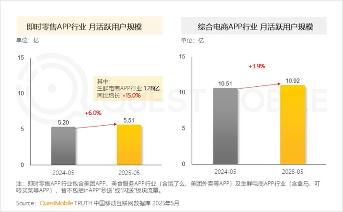 另据QuestMobile发布的即时零售行业报告,2025年5月外卖+即时零售类App的月活用户规模同比仅增6%,达到5.51亿。这说明用户总盘在缓慢增长,主要变化在于用户使用频率和跨平台行为。