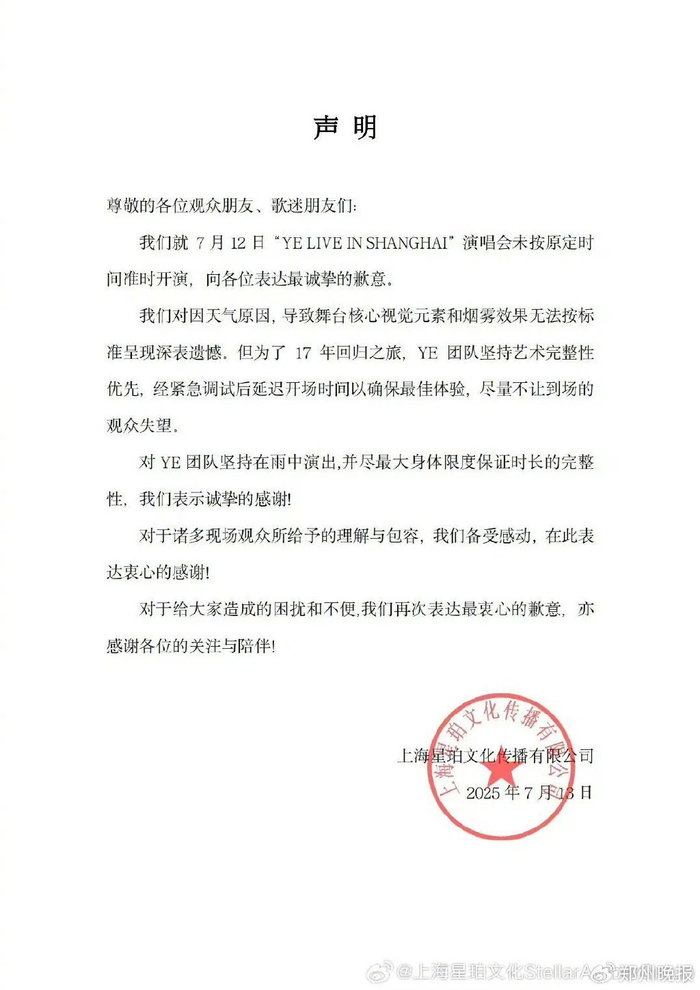 7月12日,侃爷上海演唱会迟到近50分钟,现场观众怒喊“退票”。7月13日晚,“侃爷”演唱会主办方致歉。