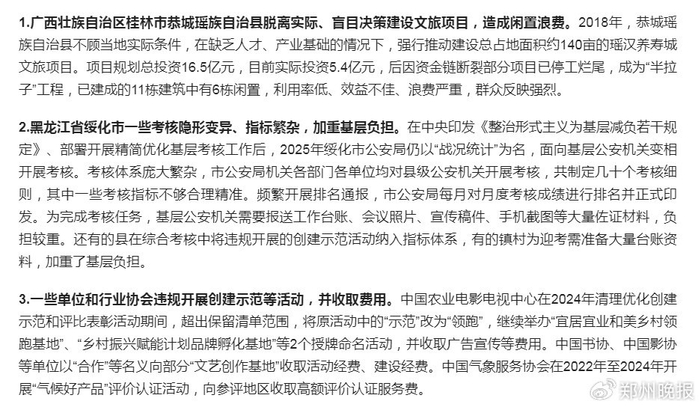 日前,中央层面整治形式主义为基层减负专项工作机制办公室会同中央纪委办公厅对3起整治形式主义为基层减负典型问题进行通报。具体如下: