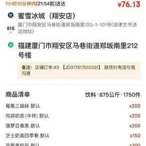 此事的起因是,网上流传的一张骑手接单页面截图显示,有消费者通过京东外卖平台在厦门市蜜雪冰城(翔安店)下单了1750件饮品,累计重量875公斤,费用显示为76.13元,订单预计在1小时10分钟内送达。地址显示为厦门市翔安区马巷街道郑坂南里120—1—101号。