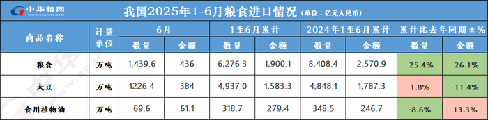 7月14日,海关总署发布最新数据:2025年1-6月我国累计进口粮食量为6276.3万吨,同比减少25.4%;进口金额为1900亿元人民币,较去年减少26.1%。