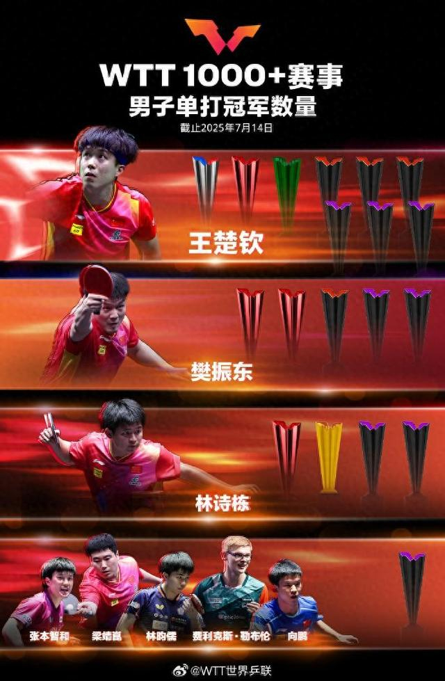 王楚钦9冠、孙颖莎12冠!断崖式领跑冠军榜