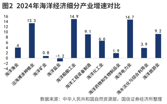 2024年海洋船舶工业、海洋工程装备、海洋电力业、海洋油气业、海洋渔业、海洋水产品加工业、海洋旅游业、海洋交通运输业增速分别为15.5%、9.1%、14.6%、1.7%、4.3%、3.6%、10.8%、9.3%,综合来看,深海科技产业链上下游增速最高、其次是海洋旅游业、海洋渔业与水产品加工业。