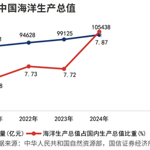 根据国金证券研报显示,2024年全国海洋产业生产总值10.5万亿元,同比增长5.9%,增速比国内生产总值高0.9个百分点,占国内生产总值比重为7.8%。其中海洋产业生产总值4.4万亿元,同比增长7.5%。海洋船舶工业、海洋工程装备制造业、海洋电力业、海洋旅游业等均实现了9%以上增长,释放出较高的增长潜力。