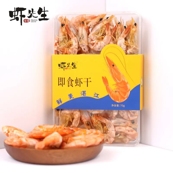 虾先生即食虾干严选优质的鲜活海鲜作为原料,通过暖风烘制而成,干净健康,味道自然鲜甜,嚼劲十足,产品开罐即食,方便快捷,健康美味,且不添加色素,保持了海鲜的原汁原味。