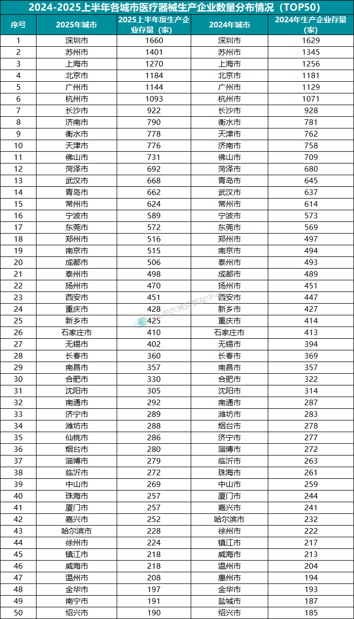 通过对比2024全年与2025上半年的TOP50城市排行榜可以发现,相较于2024年的TOP50城市,2025年上半年排行中新增仙桃市与南宁市上榜,惠州市与盐城市则遗憾落榜。并且仙桃市一举跃居至排行榜第35位,可从数据中窥知在近一年内当地医疗器械产业有了一定突破。