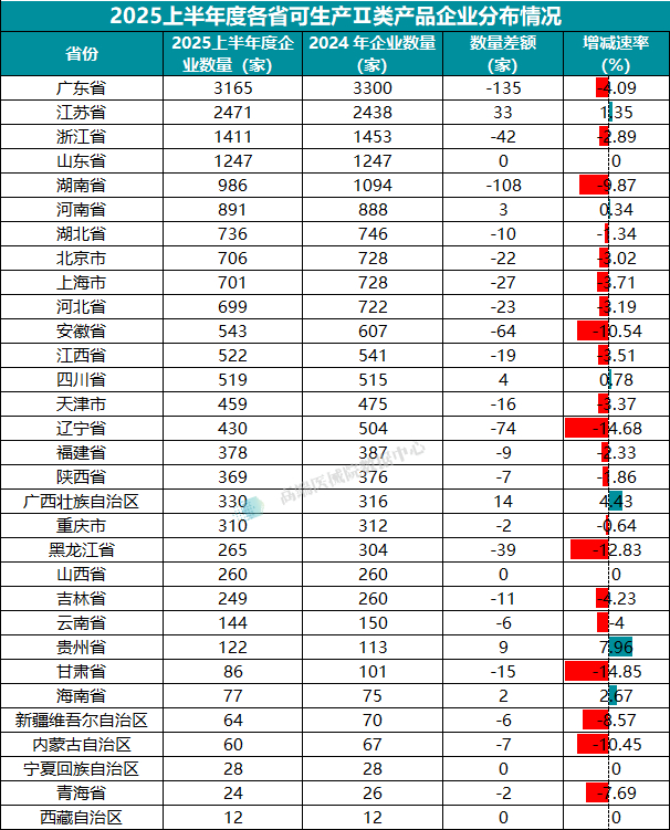 从增减趋势看,2025年上半年可生产Ⅱ类医疗器械企业数量增长最多的省份是江苏省,增加了33家企业,其次是广西省和贵州省,分别增加了14家、9家。大多数省份的企业数量均在减少或维持不变。其中减少最多的省份是广东省、湖南省、辽宁省,分别减少了135家、108家、74家。