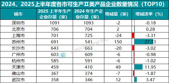 根据2025年上半年度可生产Ⅱ类产品企业的最新TOP10可以发现,相较于2024年,半年间北京市与苏州市的排名均有所提高,苏州更是一举前进三位,来到第四名。在企业的增减量上增加了150家企业,增长率达到了27.73%,其次是天津市的增量达到29家,增长率达到了11.95%。