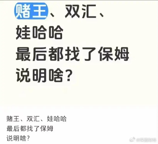 因此,有网友打趣地说,“没能出生在富贵人家,当保姆靠近富贵人家也是一种简单的致富方式。”