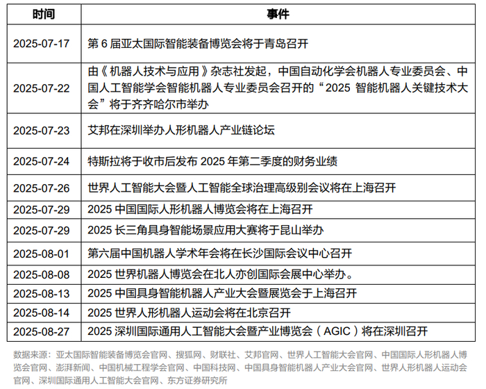 诸如7~8月份,特斯拉将公布二季度财报,世界人工智能大会、中国国际人形机器人博览会、世界人形机器人运动会即将举办等等