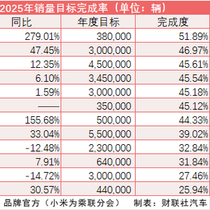 新势力车企中,小米汽车和零跑汽车势头正盛。小米汽车作为后来者,上半年累计交付超过16万辆,年度目标35万辆,完成率46%,6月上市的YU7则有望进一步提升销量;零跑汽车上半年累计交付22.17万辆,同比增长155.68%,首度登顶半年销量榜,其全年目标50万辆,目前完成44.3%。