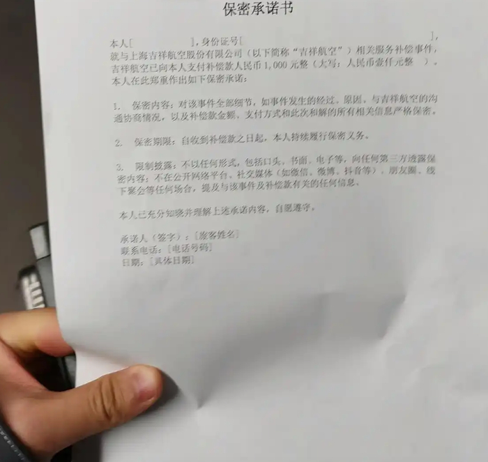 据乘客提供的保密承诺书显示,吉祥航空承诺给乘客1000元补偿,但要求乘客不能通过包括口头、书面、电子等在内的形式向第三方透露保密内容,也不能在公开网络平台、社交媒体、朋友圈、线下聚会等任何场合,提及与该事件及补偿款有关的任何信息。