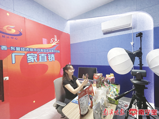 在南宁智源创业孵化基地,创业商家正在线上直播。