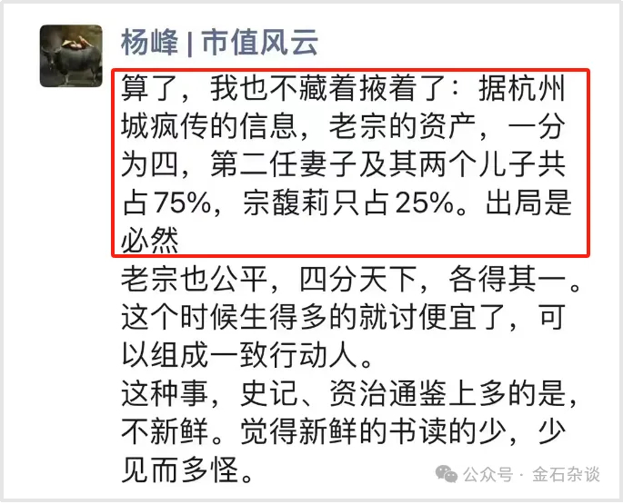 知名自媒体平台市值风云董事长杨峰也曾爆料:老宗的资产,一分为四,第二任妻子及其两个儿子共占75%,宗馥莉只有25%。