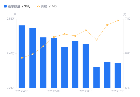 近一年(2024年7月10日至2025年7月10日),中辰股份A股股东户数从2.49万户,减低至2.36万户,降幅5.23%,区间股价上涨32.31%。