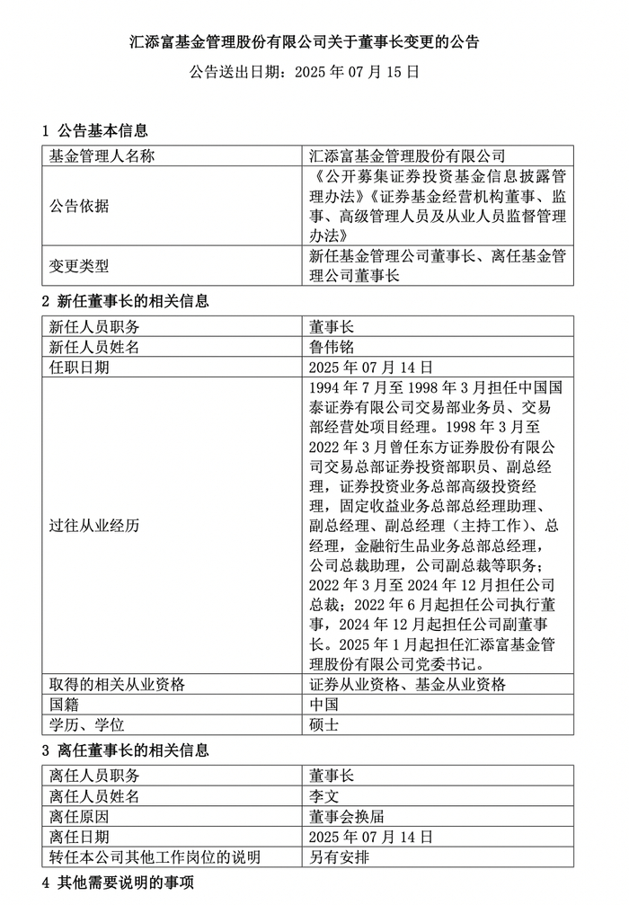 7月14日晚间,汇添富基金发布公告称,李文因董事会换届离任董事长,东方证券股份有限公司(简称“东方证券”,600958.SH)副董事长、汇添富基金党委书记鲁伟铭接任董事长职位,任职日期为2025年7月14日。