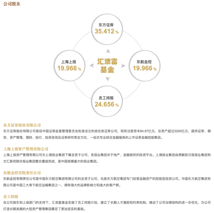 从公司股权结构来看,汇添富基金是一家“券商系”公募,东方证券为其第一大股东,持股比例为35.412%,员工持股比例达24.656%,上海上报资产管理有限公司、东航金控有限责任公司则均持有19.966%的股份。