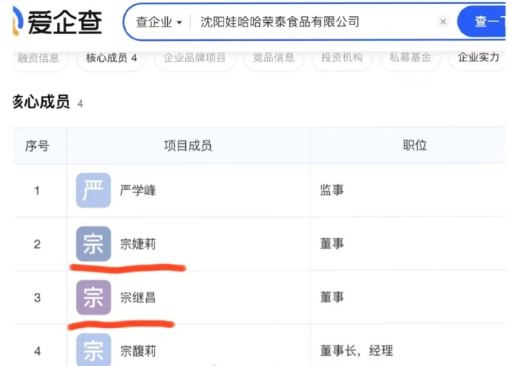 调查发现,宗继昌在大理、沈阳、天津等地的娃哈哈分厂担任董事,宗婕莉则在沈阳荣泰食品公司任职。