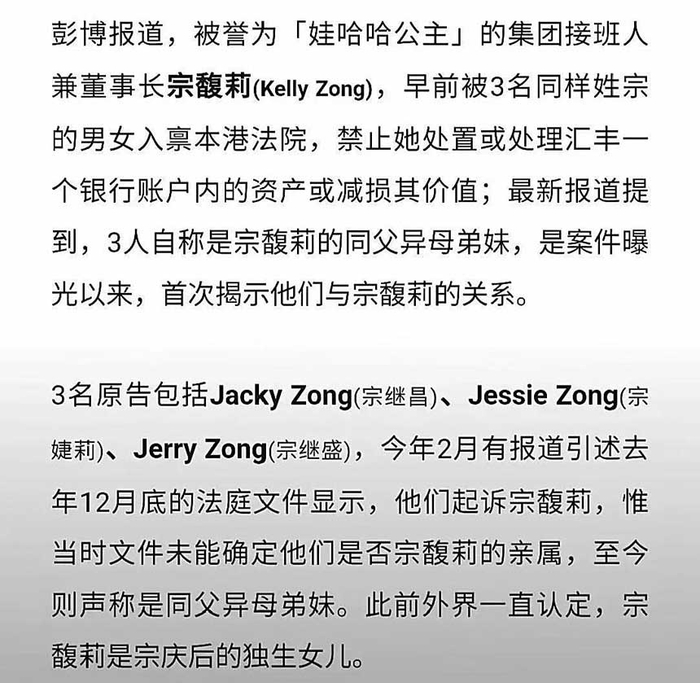 7 月 13 日,香港高等法院的一纸诉状震惊商界。三名原告宗继昌(Jacky Zong)、宗婕莉(Jessie Zong)和宗继盛(Jerry Zong)通过律师宣称,他们是宗庆后与前高管杜建英所生的非婚生子女,要求平等继承宗庆后的遗产。